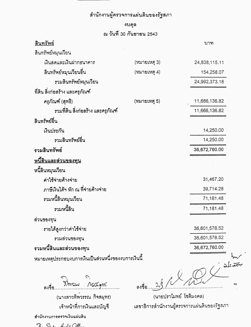 • งบการเงินสำหรับงวดตั้งแต่วันที่ 21 มีนาคม 2543 ถึงวันที่ 30 กันยายน 2543 ขอดำเนินสำนักงานผู้ตรวจการแผ่นดินของรัฐสภา