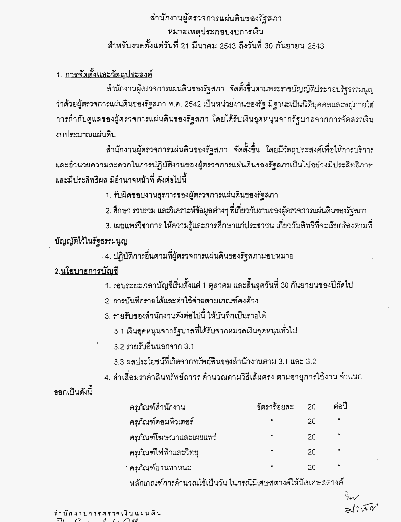 • งบการเงินสำหรับงวดตั้งแต่วันที่ 21 มีนาคม 2543 ถึงวันที่ 30 กันยายน 2543 ขอดำเนินสำนักงานผู้ตรวจการแผ่นดินของรัฐสภา