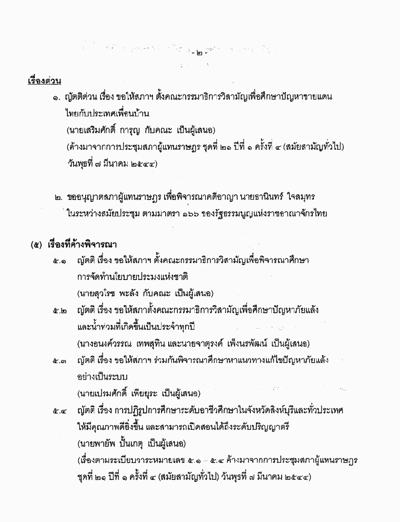 • ระเบียบวาระการประชุมสภาผู้แทนราษฎร ชุดที่ ๒๑ ปีที่ ๑ ครั้งที่ ๖ (สมัยสามัญทั่วไป) วันพฤหัสบดีที่ ๑๕ มีนาคม ๒๕๔๔