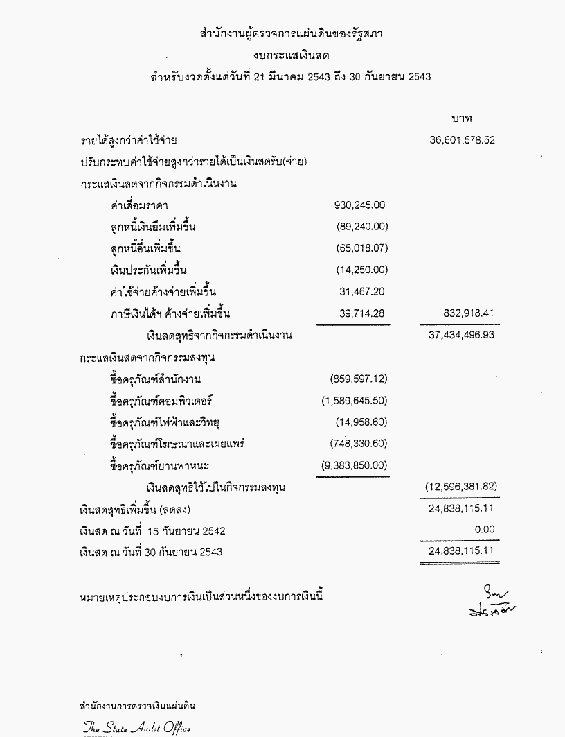 • งบการเงินสำหรับงวดตั้งแต่วันที่ 21 มีนาคม 2543 ถึงวันที่ 30 กันยายน 2543 ขอดำเนินสำนักงานผู้ตรวจการแผ่นดินของรัฐสภา
