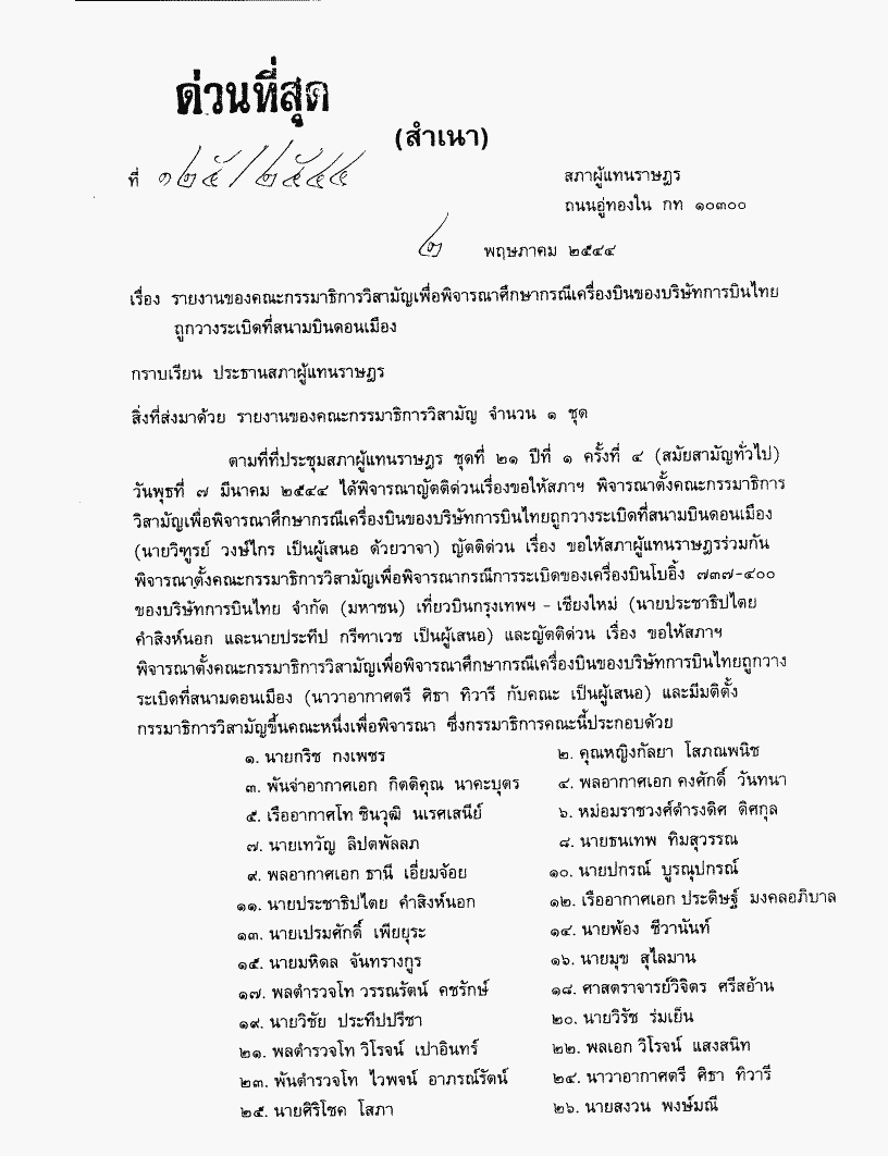 รายงานของคณะกรรมาธิการวิสามัญเพื่อพิจารณาศึกษากรณีเครื่องบินของบริษัทการบินไทยถูกวางระเบิดที่สนามบินดอนเมืองซึ่งคณะกรรมาธิการวิสามัญพิจารณาเสร็จแล้ว