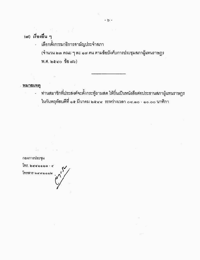 • ระเบียบวาระการประชุมสภาผู้แทนราษฎร ชุดที่ ๒๑ ปีที่ ๑ ครั้งที่ ๖ (สมัยสามัญทั่วไป) วันพฤหัสบดีที่ ๑๕ มีนาคม ๒๕๔๔
