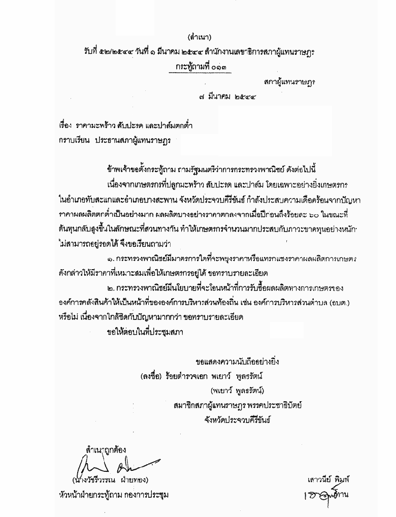 กระทู้ถามที่ ๐๑๓ เรื่อง ราคามะพร้าว สับประรด และปาล์มตกต่ำ |