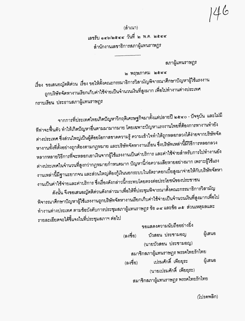 ขอเสนอญัตติด่วน เรื่อง ขอให้ตั้งคณะกรรมาธิการวิสามัญพิจารณาศึกษาปัญหาผู้ใช้แรงงานถูกบริษัทจัดหางานเรียกเก็บค่าใช้จ่ายเป็นจำนวนเงินที่สูงมาก เพื่อไปทำงานต่างประเทศ |
