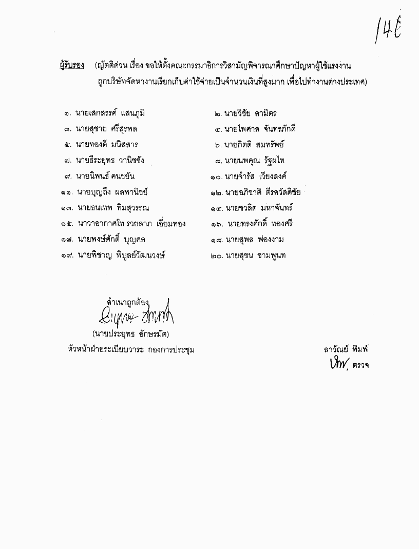 • ขอเสนอญัตติด่วน เรื่อง ขอให้ตั้งคณะกรรมาธิการวิสามัญพิจารณาศึกษาปัญหาผู้ใช้แรงงานถูกบริษัทจัดหางานเรียกเก็บค่าใช้จ่ายเป็นจำนวนเงินที่สูงมาก เพื่อไปทำงานต่างประเทศ