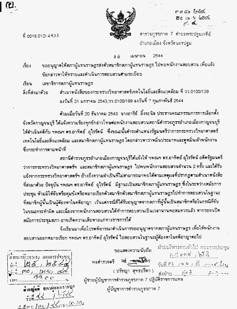 ขออนุญาตสภาผู้แทนราษฎรเพื่อให้พนักงานสอบสวนออกหมายเรียก นายอาทิตย์ อุไรรัตน์ ไปสอบสวนในฐานะผู้ต้องหาคดีอาญา |