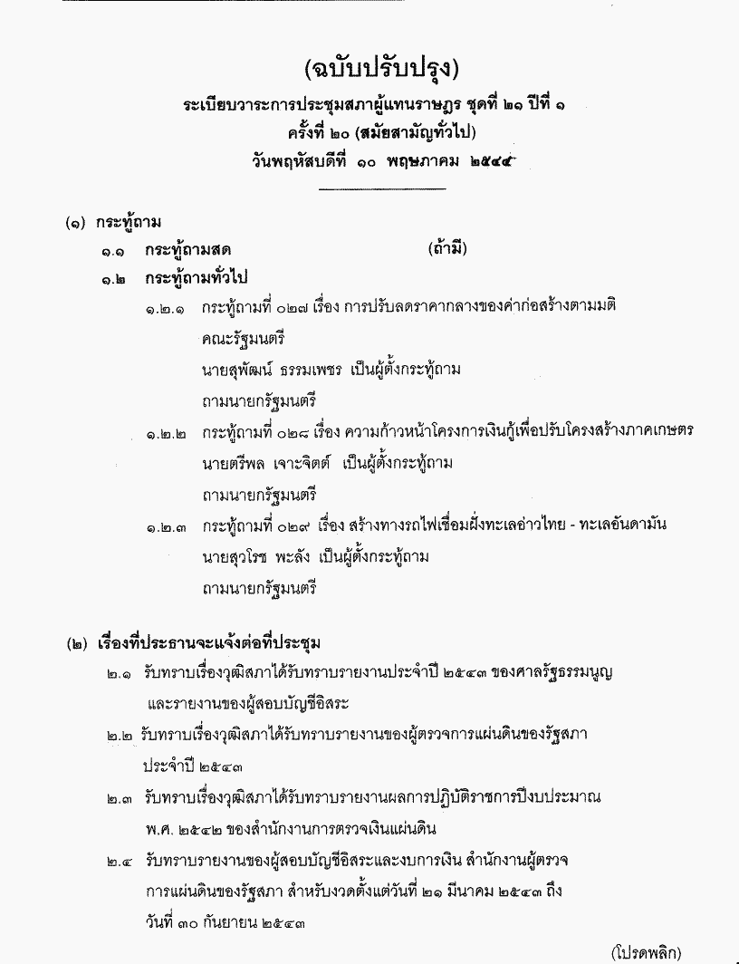 • (ฉบับปรับปรุง) ระเบียบวาระการประชุมสภาผู้แทนราษฎร ชุดที่ 21 ปีที่ 1 ครั้งที่ 20 (สมัยสามัญทั่วไป) วันพฤหัสบดีที่ 10 พฤษภาคม 2544