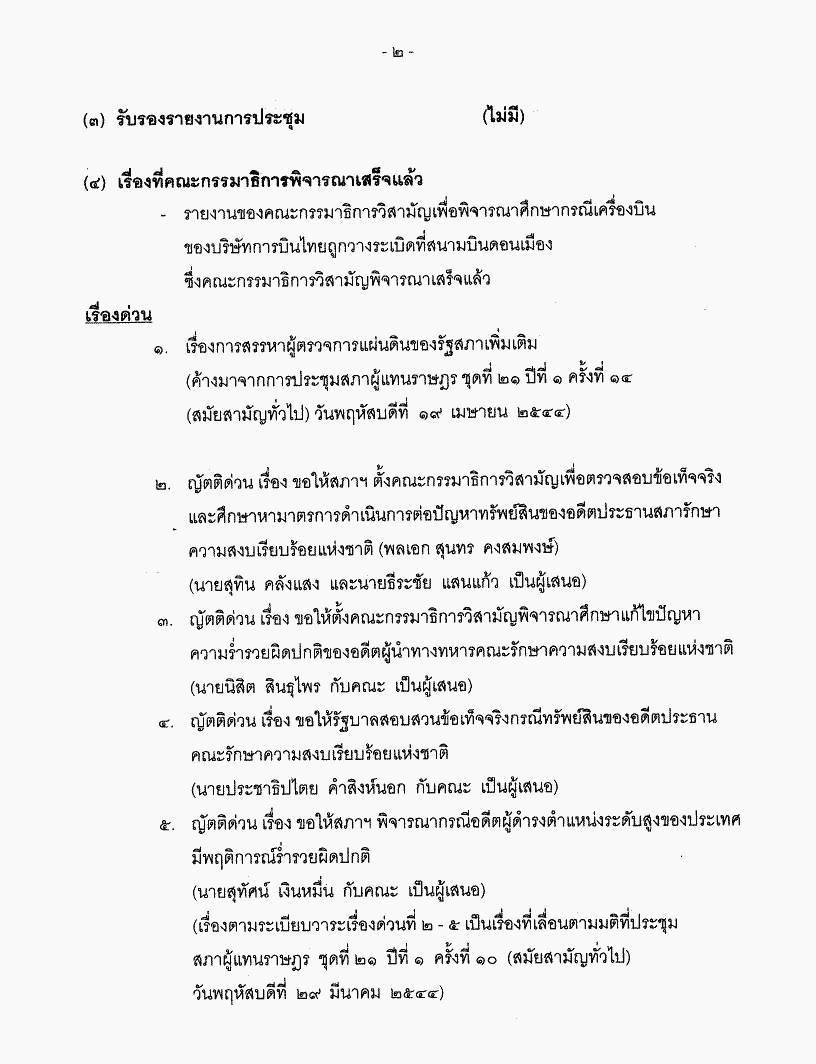 • (ฉบับปรับปรุง) ระเบียบวาระการประชุมสภาผู้แทนราษฎร ชุดที่ 21 ปีที่ 1 ครั้งที่ 20 (สมัยสามัญทั่วไป) วันพฤหัสบดีที่ 10 พฤษภาคม 2544