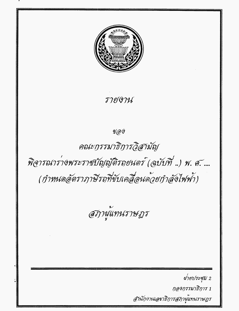 • ร่างพระราชบัญญัติรถยนตร์ (ฉบับที่ ..) พ.ศ. .... (กำหนดอัตราภาษีรถที่ขับเคลื่อนด้วยกำลังไฟฟ้า)
