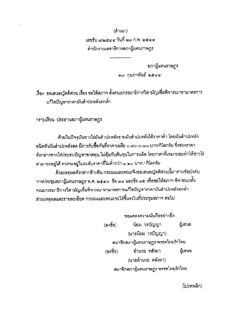 ขอเสนอญัตติด่วน เรื่อง ขอให้สภาฯ ตั้งคณะกรรมาธิการวิสามัญเพื่อพิจารณาหามาตรการแก้ไขปัญหาราคามันสำปะหลังตกต่ำ |