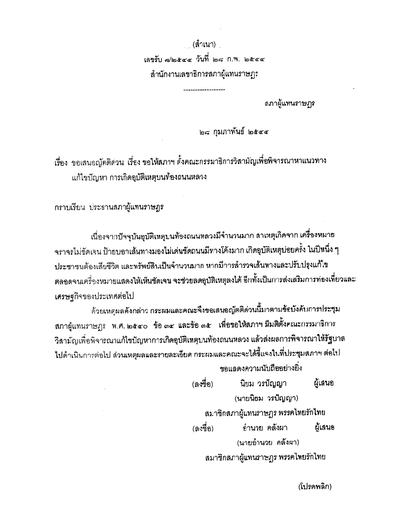 ขอเสนอญัตติด่วน เรื่อง ขอให้สภาฯ ตั้งคณะกรรมาธิการวิสามัญเพื่อพิจารณาหาแนวทางแก้ไขปัญหาการเกิดอุบัติเหตุบนท้องถนนหลวง |