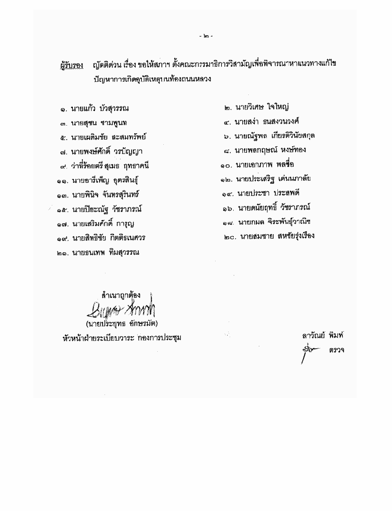 • ขอเสนอญัตติด่วน เรื่อง ขอให้สภาฯ ตั้งคณะกรรมาธิการวิสามัญเพื่อพิจารณาหาแนวทางแก้ไขปัญหาการเกิดอุบัติเหตุบนท้องถนนหลวง