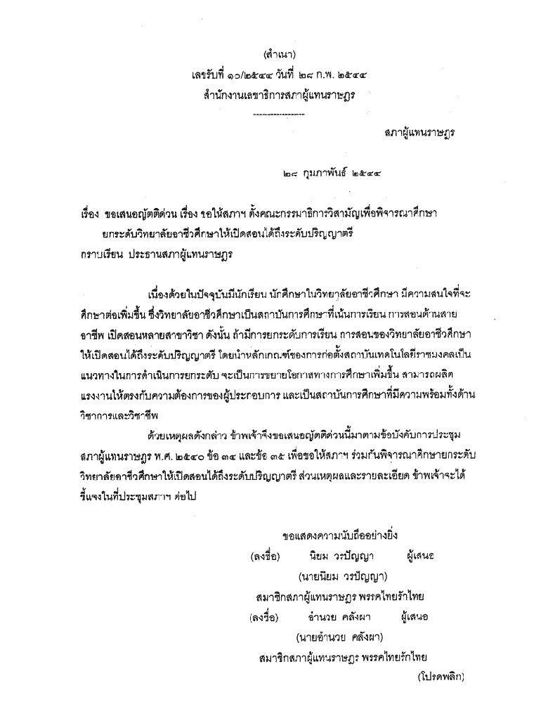 • ขอเสนอญัตติด่วน เรื่อง ขอให้สภาฯ ตั้งคณะกรรมาธิการวิสามัญเพื่อพิจารณาศึกษายกระดับวิทยาลัยอาชีวศึกษาให้เปิดสอนได้ถึงระดับปริญญาตรี