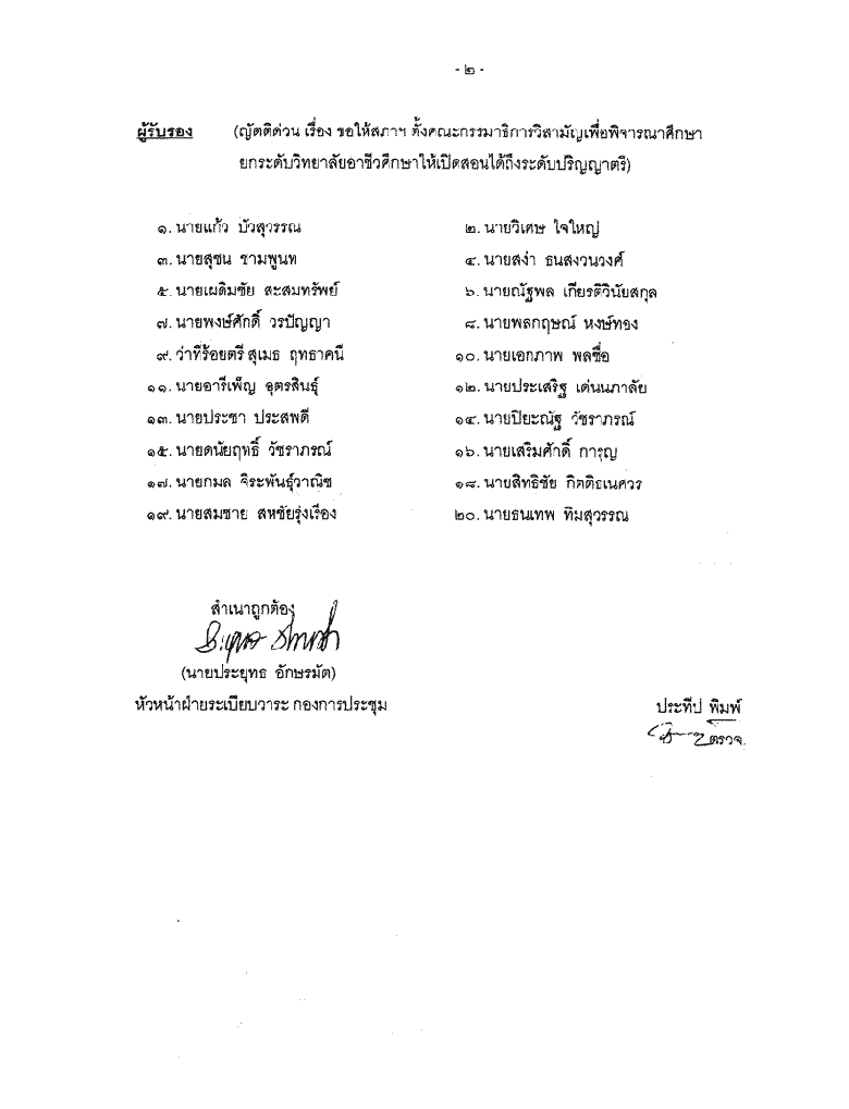 ขอเสนอญัตติด่วน เรื่อง ขอให้สภาฯ ตั้งคณะกรรมาธิการวิสามัญเพื่อพิจารณาศึกษายกระดับวิทยาลัยอาชีวศึกษาให้เปิดสอนได้ถึงระดับปริญญาตรี |