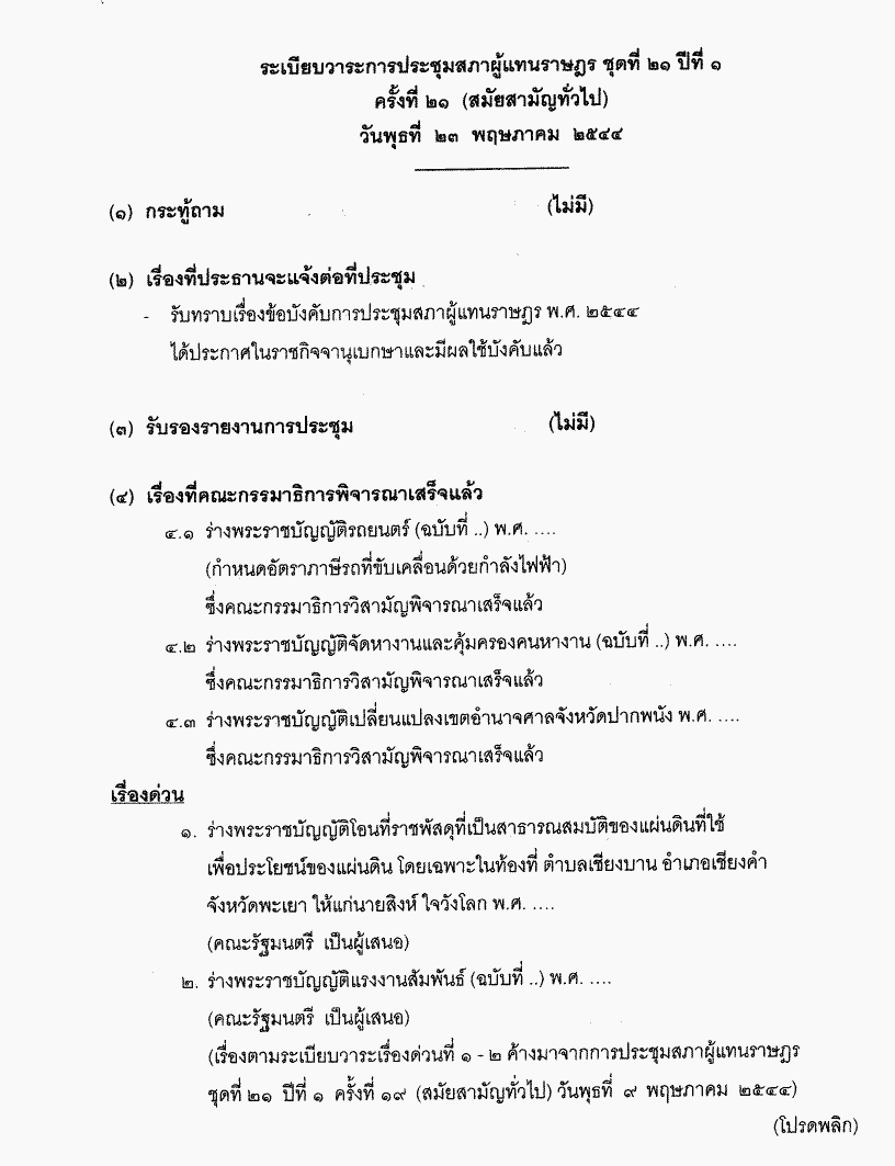 • ระเบียบวาระการประชุมสภาผู้แทนราษฎร > ชุดที่ 21 > ปีที่ 1 > สมัยสามัญทั่วไป > ครั้งที่ 21