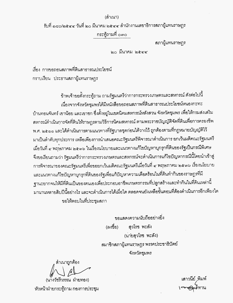 กระทู้ถามที่ 030 เรื่อง การขอถอนสภาพที่ดินสาธารณประโยชน์ นายสุวโรช พะลัง เป็นผู้ตั้งกระทู้ถาม ถามรัฐมนตรีว่าการกระทรววงเกษตรและสหกรณ์ |