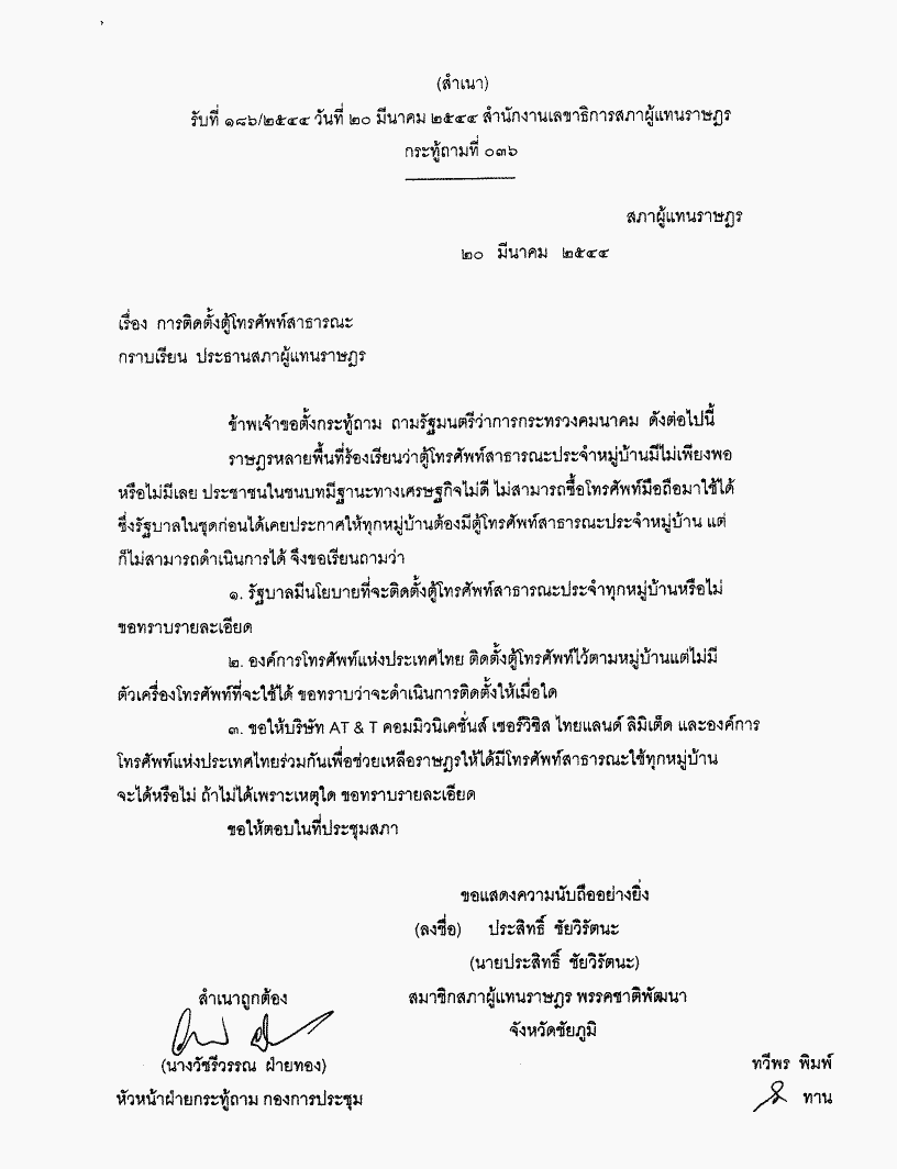กระทู้ถามที่ 036 เรื่อง การติดตั้งตู้โทรศัพท์สาธารณะ นายประสิทธิ์ ชัยวิรัตนะ เป็นผู้ตั้งกระทู้ถาม ถามรัฐมนตรีว่าการกระทรวงคมนาคม |
