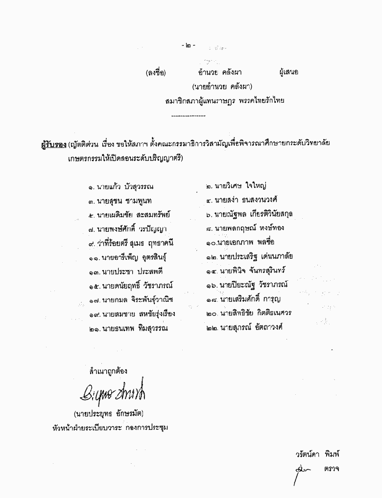 ขอเสนอญัตติด่วน เรื่อง ขอให้สภาฯ ตั้งคณะกรรมาธิการวิสามัญเพื่อพิจารณาศึกษายกระดับวิทยาลัยเกษตรกรรมให้เปิดสอนได้ถึงระดับปริญญาตรี |