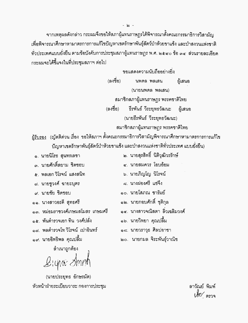 ขอเสนอญัตติด่วน เรื่อง ขอให้สภาฯ ตั้งคณะกรรมาธิการวิสามัญพิจารณาศึกษาหามาตรการการแก้ไขปัญหาเขตรักษาพันธุ์สัตวป่าห้วยขาแข้ง และป่าสงวนแห่งชาติทั่วประเทศ แบบยั่งยืน |