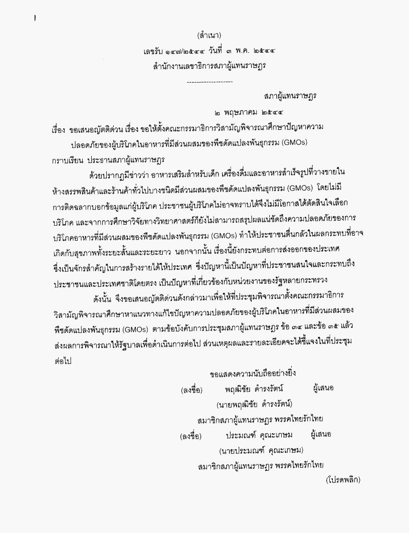 ขอเสนอญัตติด่วน เรื่อง ขอให้ตั้งคณะกรรมาธิการวิสามัญพิจารณาศึกษาปัญหาความปลอดภัยของผู้บริโภคในอาหารที่มีส่วนผสมของพืชดัดแปลงพันธุกรรม (GMOs) |