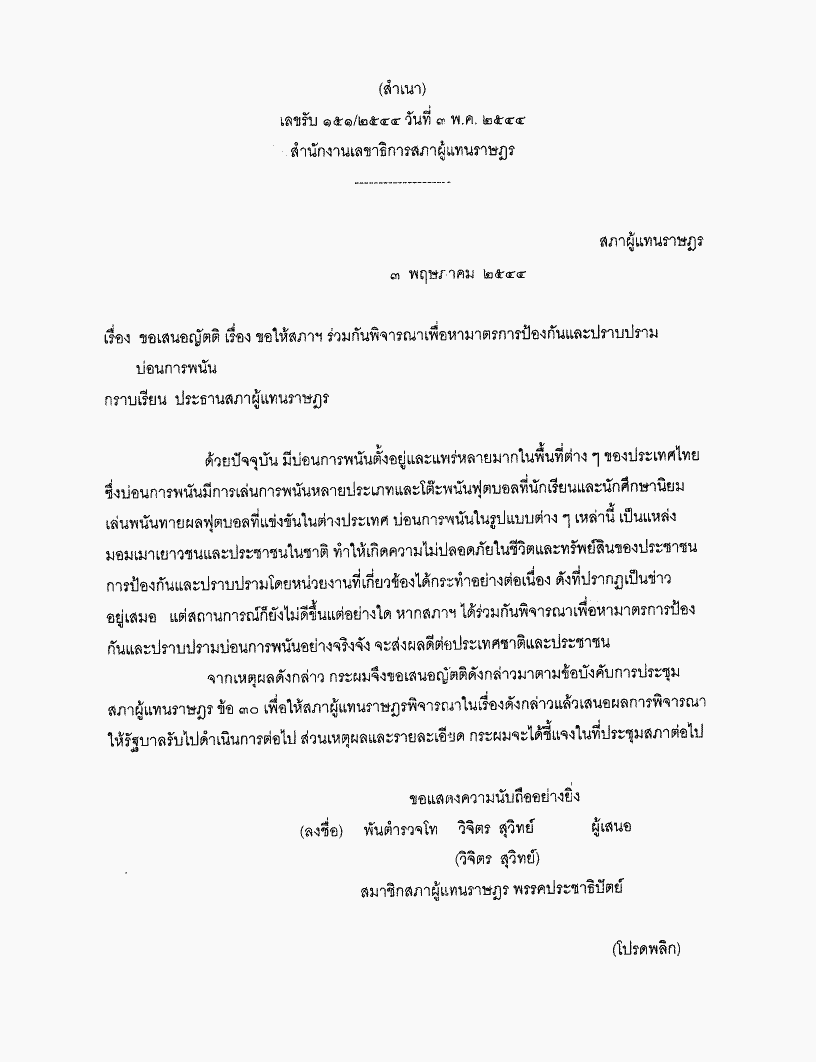 ขอเสนอญัตติ เรื่อง ขอให้สภาฯ ร่วมกันพิจารณาเพื่อหามาตรการป้องกันและปราบปรามบ่อนการพนัน |