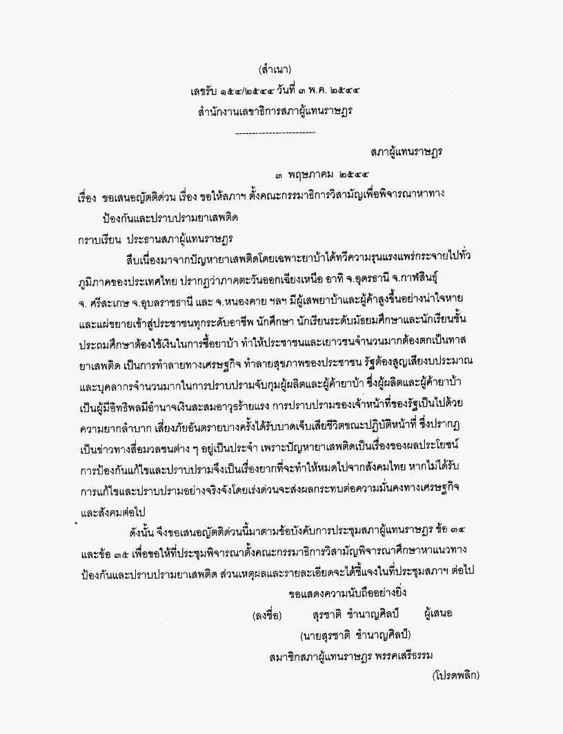 ขอเสนอญัตติด่วน เรื่อง ขอให้สภาฯ ตั้งคณะกรรมาธิการวิสามัญเพื่อพิจารณาหาทางป้องกันและปราบปรามยาเสพติด |