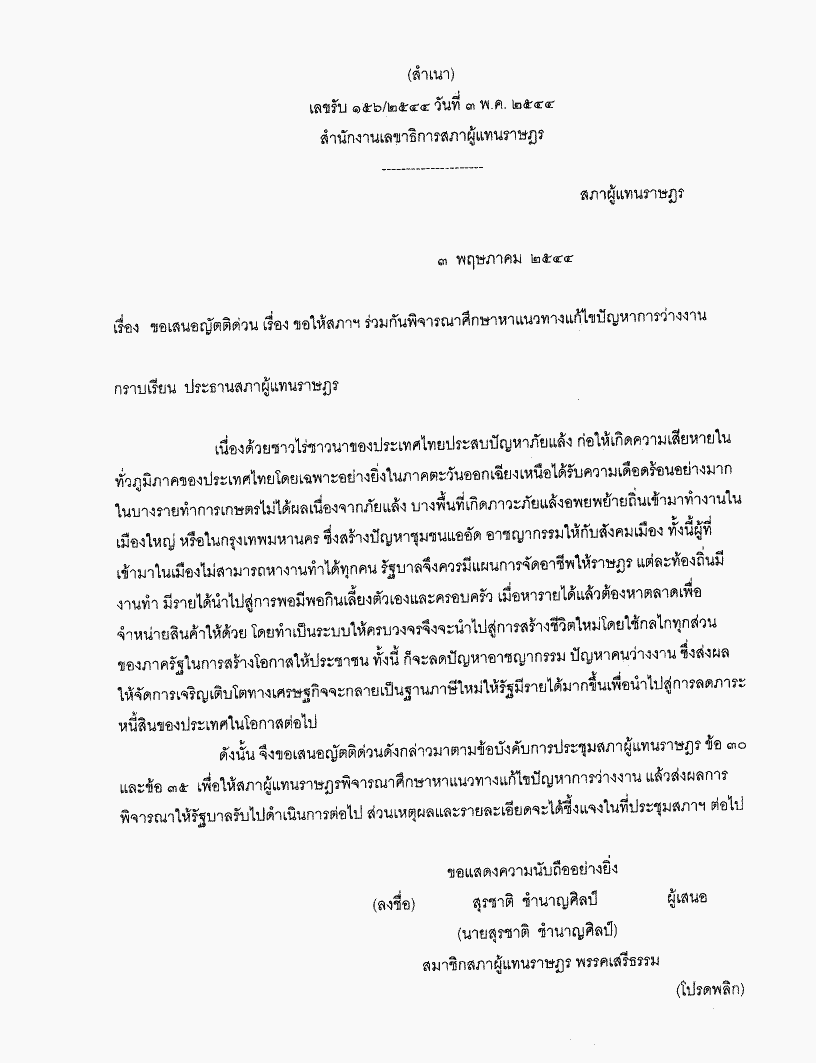 ขอเสนอญัตติด่วน เรื่อง ขอให้สภาฯ ร่วมกันพิจารณาศึกษาหาแนวทางแก้ไขปัญหาการว่างงาน |