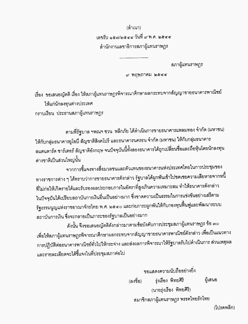 • ขอเสนอญัตติ เรื่อง ให้สภาผู้แทนราษฎรพิจารณาศึกษาผลกระทบจากสัญญาขายธนาคารพาณิชย์ให้แก่นักลงทุนต่างประเทศ