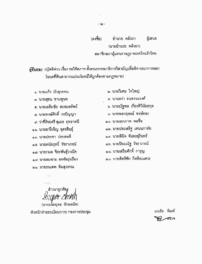 ขอเสนอญัตติด่วน เรื่อง ขอให้สภาฯ ตั้งคณะกรรมาธิการวิสามัญเพื่อพิจารณาการออกโฉนดที่ดินสาธารณประโยชน์ให้ถูกต้องตามกฎหมาย |