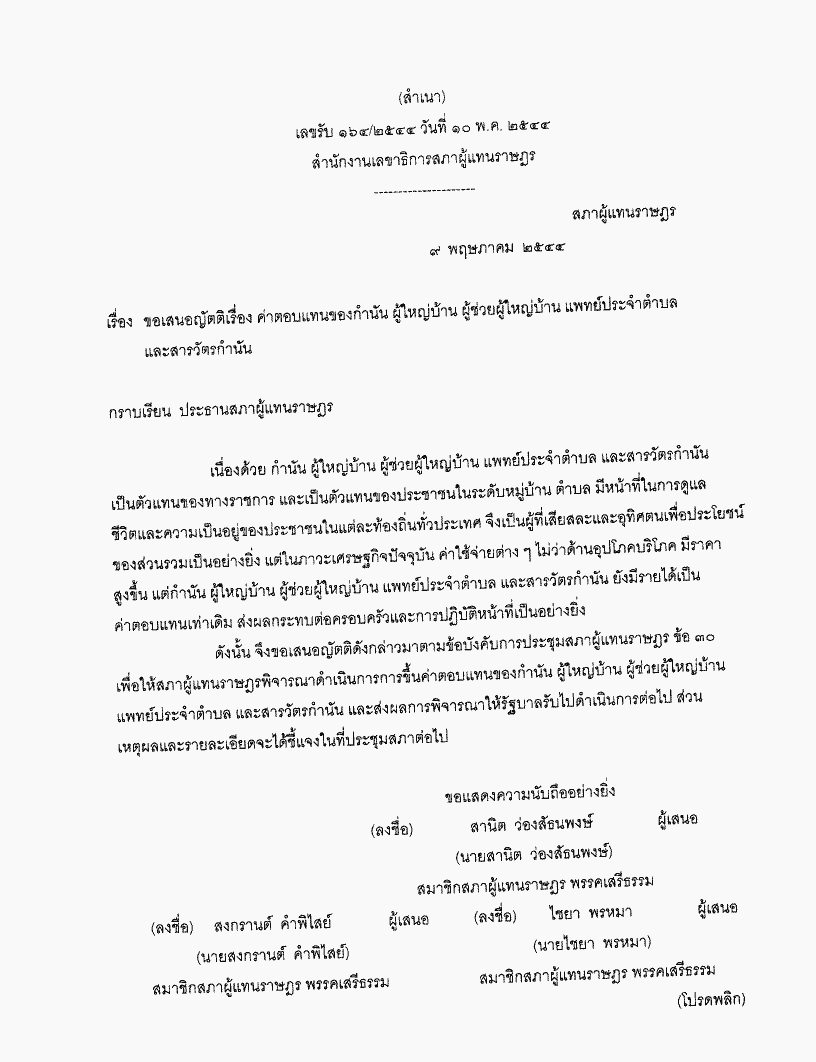 ขอเสนอญัตติเรื่อง ค่าตอบแทนของกำนัน ผู้ใหญ่บ้าน ผู้ช่วยผู้ใหญ่บ้าน แพทย์ประจำตำบลและสารวัตรกำนัน |