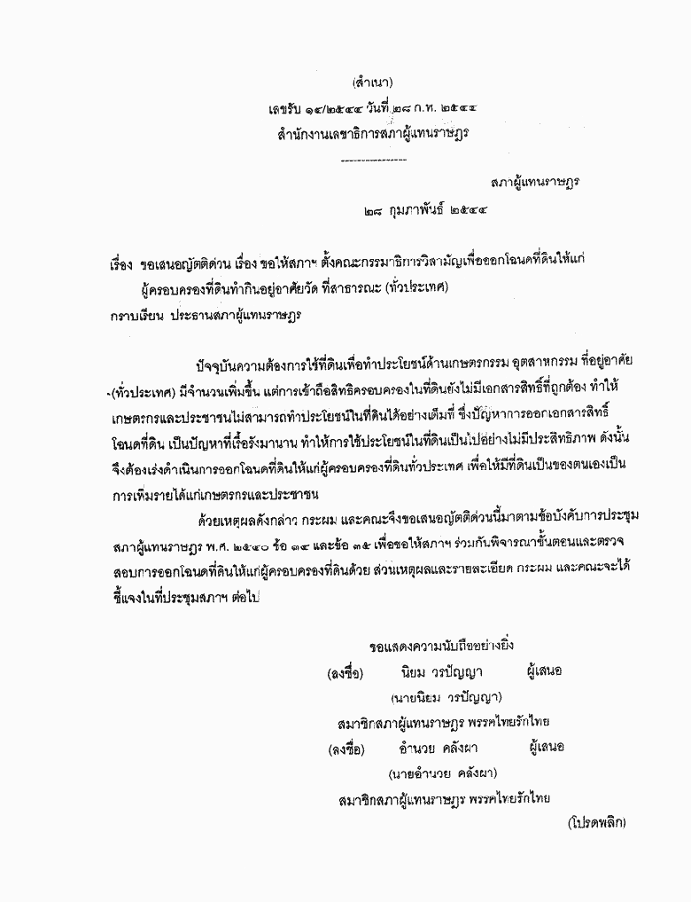 • ขอเสนอญัตติด่วน เรื่อง ขอให้สภาฯ ตั้งคณะกรรมาธิการวิสามัญเพื่อออกโฉนดที่ดินให้แก่ผู้ครอบครองที่ดินทำกินอยู่อาศัยวัด ที่สาธารณะ