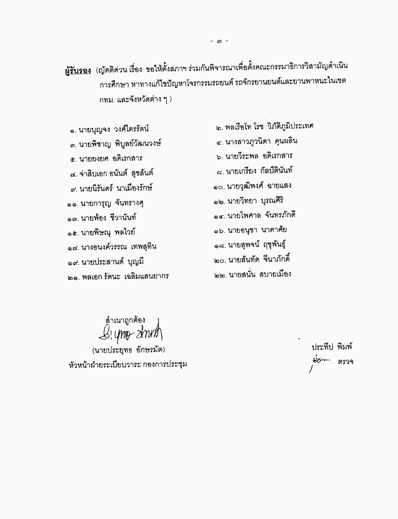 • ขอเสนอญัตติด่วน เรื่อง ขอให้สภาฯ ร่วมกันพิจารณาเพื่อตั้งคณะกรรมาธิการวิสามัญดำเนินการศึกษา หาทางแก้ไขปัญหาโจรกรรมรถยนต์ รถจักรยานยนต์และยานพาหนะในเขต กทม. และจังหวัดต่าง ๆ