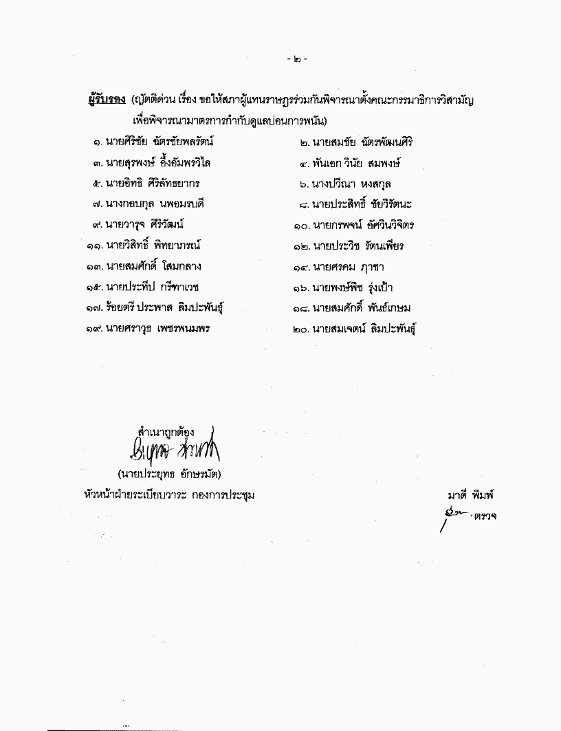 • ขอเสนอญัตติด่วน เรื่อง ขอให้สภาผู้แทนราษฎรร่วมกันพิจารณาตั้งคณะกรรมาธิการวิสามัญเพื่อพิจารณามาตรการกำกับดูแลบ่อนการพนัน