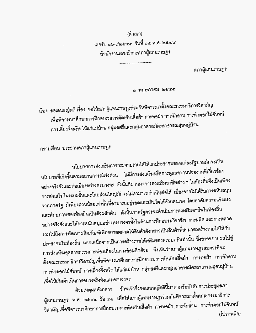 ขอเสนอญัตติ เรื่อง ขอให้สภาผู้แทนราษฎรร่วมกันพิจารณาตั้งคณะกรรมาธิการวิสามัญเพื่อพิจารณาศึกษาการฝึกอบรมการตัดเย็บเสื้อผ้า การทอผ้า การจักสาน การทำดอกไม้จันทน์การเลี้ยงจิ้งหรีดให้แก่แม่บ้าน กลุ่มสตรีและกลุ่มอาสาสมัครสาธารณสุขหมู่บ้าน |