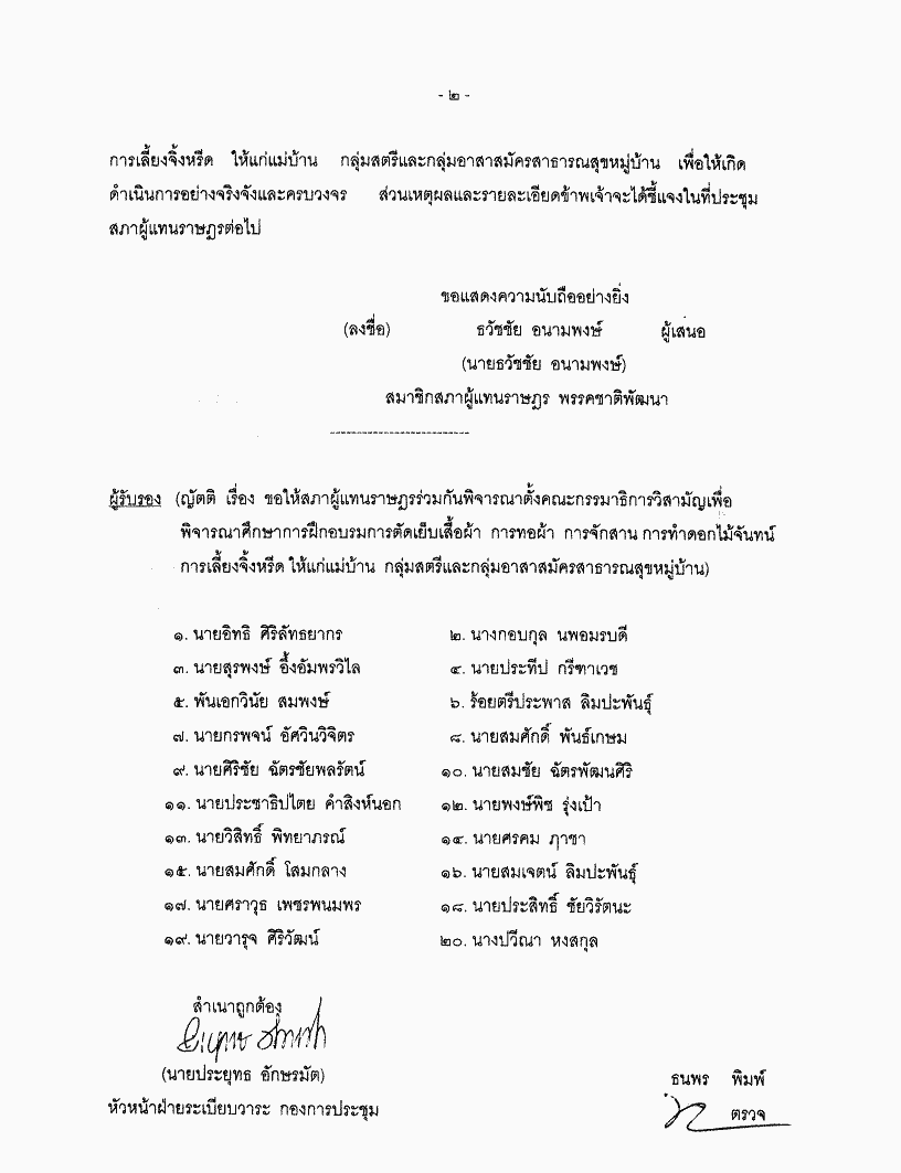 • ญัตติ เรื่อง ขอให้สภาผู้แทนราษฎรร่วมกันพิจารณาตั้งคณะกรรมาธิการวิสามัญเพื่อพิจารณาศึกษาการฝึกอบรมการตัดเย็บเสื้อผ้า การทอผ้า การจักสาน การทำดอกไม้จันทน์การเลี้ยงจิ้งหรีดให้แก่แม่บ้าน กลุ่มสตรีและกลุ่มอาสาสมัครสาธารณสุขหมู่บ้าน (นายธวัชชัย อนามพงษ์ เป็นผู้เสนอ)