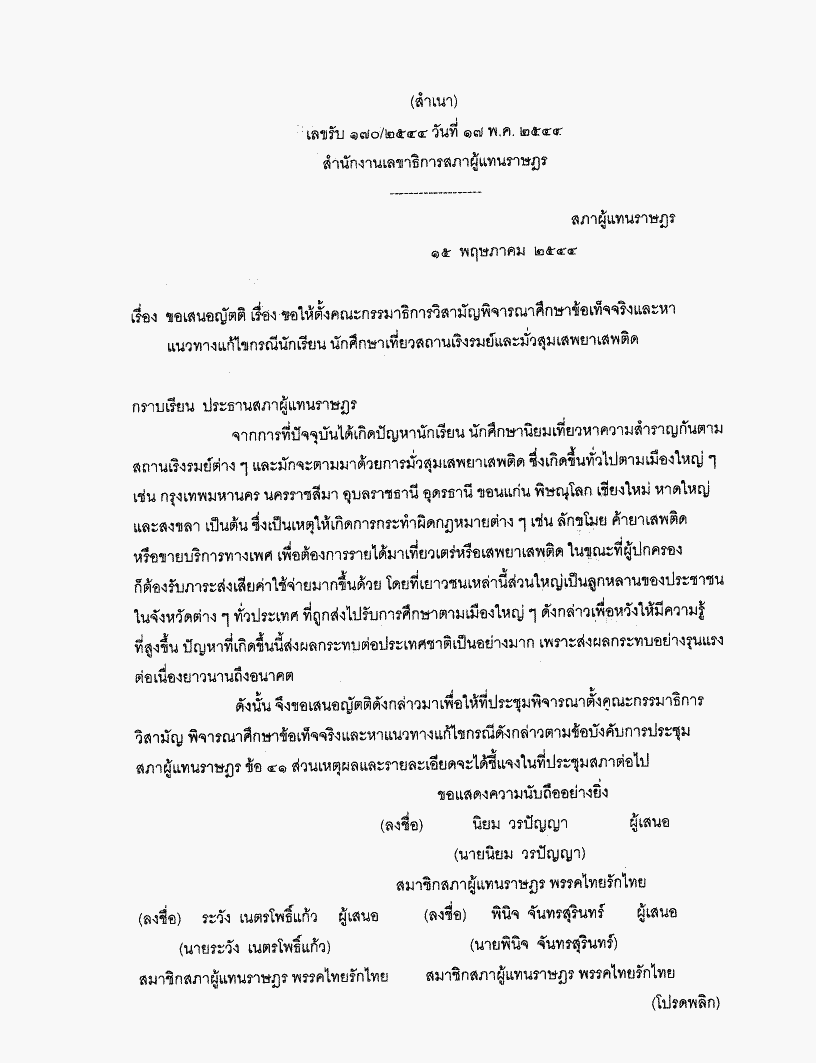 ชื่อเอกสาร :   ญัตติ เรื่อง ขอให้ตั้งคณะกรรมาธิการวิสามัญพิจารณาศึกษาข้อเท็จจริงและหาแนวทางแก้ไขกรณีนักเรียนนักศึกษาเที่ยวสถานเริงรมย์และมั่วสุมเสพยาเสพติด (นายนิยม วรปัญญา กับคณะ เป็นผู้เสนอ)