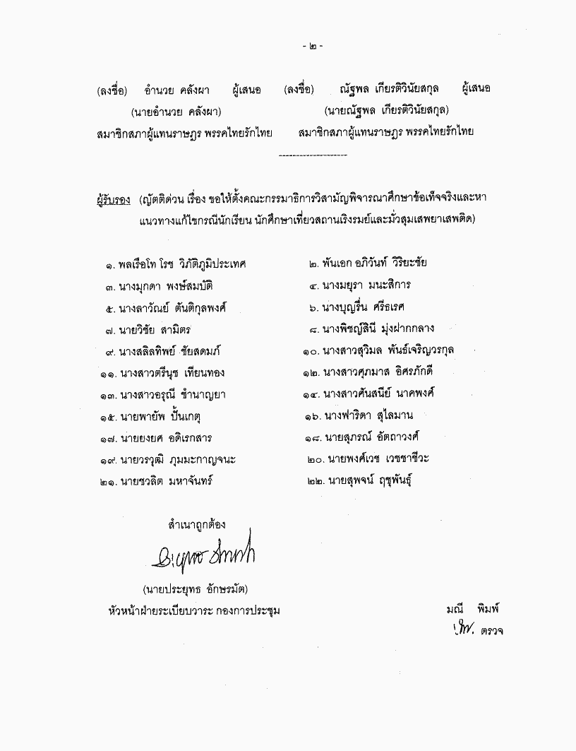 ขอเสนอญัตติ เรื่อง ขอให้ตั้งคณะกรรมาธิการวิสามัญพิจารณาศึกษาข้อเท็จจริงและหาแนวทางแก้ไขกรณีนักเรียนนักศึกษาเที่ยวสถานเริงรมย์และมั่วสุมเสพยาเสพติด |