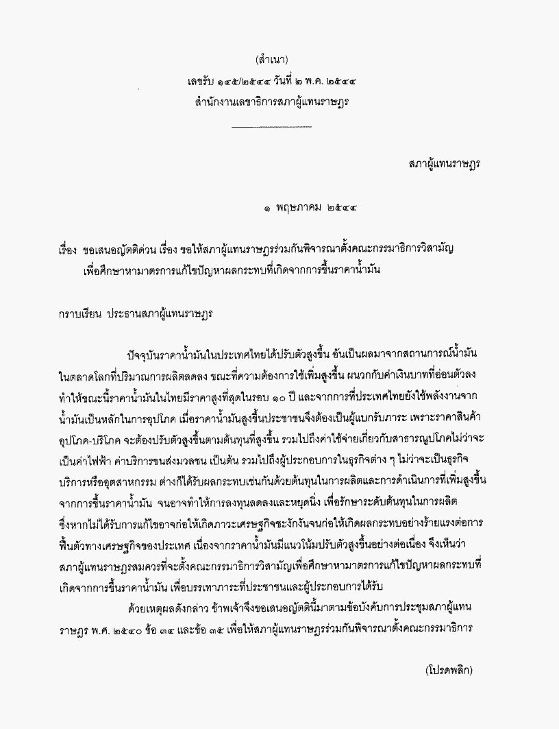 ขอเสนอญัตติด่วน เรื่อง ขอให้สภาผู้แทนราษฎรร่วมกันพิจารณาตั้งคณะกรรมาธิการวิสามัญเพื่อศึกษาหามาตรการแก้ไขปัญหาผลกระทบที่เกิดจากการขึ้นราคาน้ำมัน |