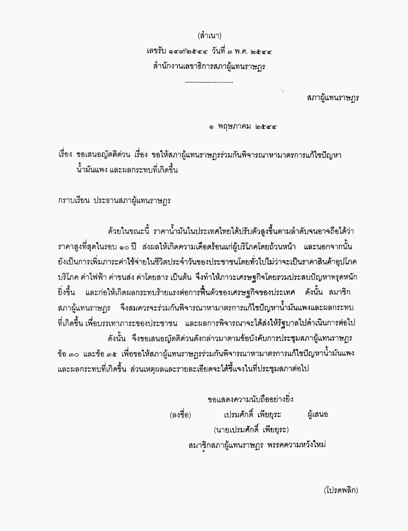• ขอเสนอญัตติด่วน เรื่อง ขอให้สภาผู้แทนราษฎรร่วมกันพิจารณาหามาตรการแก้ไขปัญหาน้ำมันแพง และผลกระทบที่เกิดขึ้น