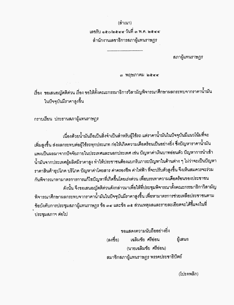 • ขอเสนอญัตติด่วน เรื่อง ขอให้ตั้งคณะกรรมาธิการวิสามัญพิจารณาศึกษาผลกระทบจากราคาน้ำมันในปัจจุบันมีราคาสูงขึ้น