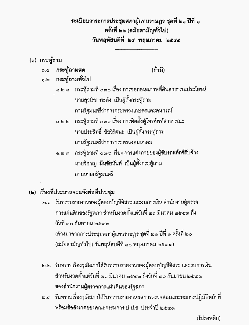 • ระเบียบวาระการประชุมสภาผู้แทนราษฎร ชุดที่ 21 ปีที่ 1 ครั้งที่ 22 (สมัยสามัญทัวไป) วันพฤหัสบดีที่ 24 พฤษภาคม 2544