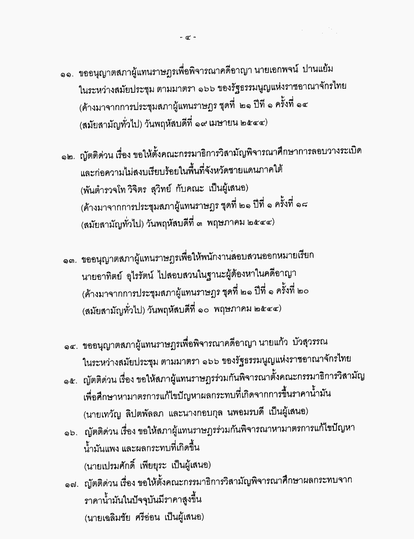 • ระเบียบวาระการประชุมสภาผู้แทนราษฎร ชุดที่ 21 ปีที่ 1 ครั้งที่ 22 (สมัยสามัญทัวไป) วันพฤหัสบดีที่ 24 พฤษภาคม 2544