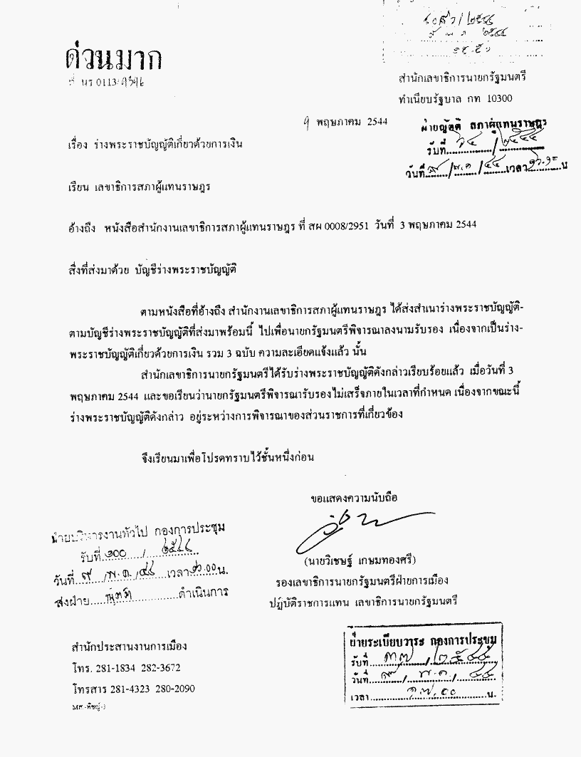ชื่อเอกสาร :   รับทราบเรื่องสำนักเลขาธิการนายกรัฐมนตรีแจ้งเหตุขัอข้องที่นายกรัฐมนตรีไม่สามารถพิจารณาให้คำรับรองร่างพระราชบัญญัติเกี่ยวด้วยการเงินได้ภายในกำหนดเวลา