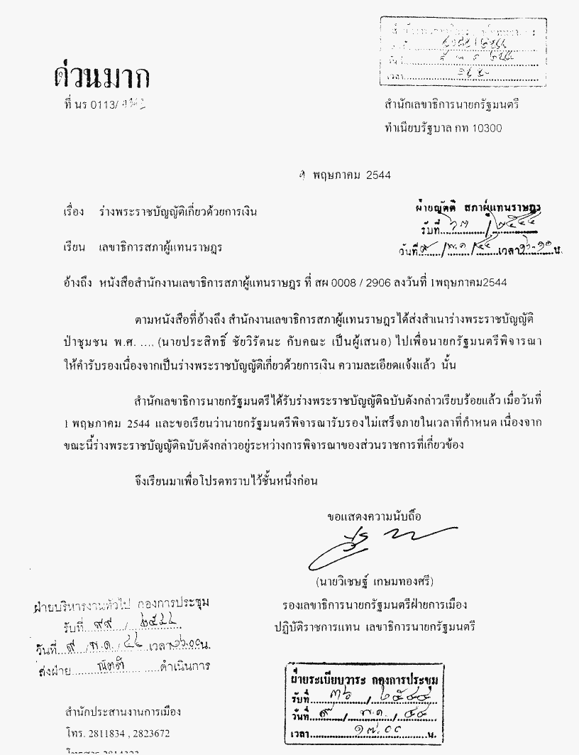 ชื่อเอกสาร :   รับทราบเรื่องสำนักเลขาธิการนายกรัฐมนตรีแจ้งเหตุขัอข้องที่นายกรัฐมนตรีไม่สามารถพิจารณาให้คำรับรองร่างพระราชบัญญัติเกี่ยวด้วยการเงินได้ภายในกำหนดเวลา