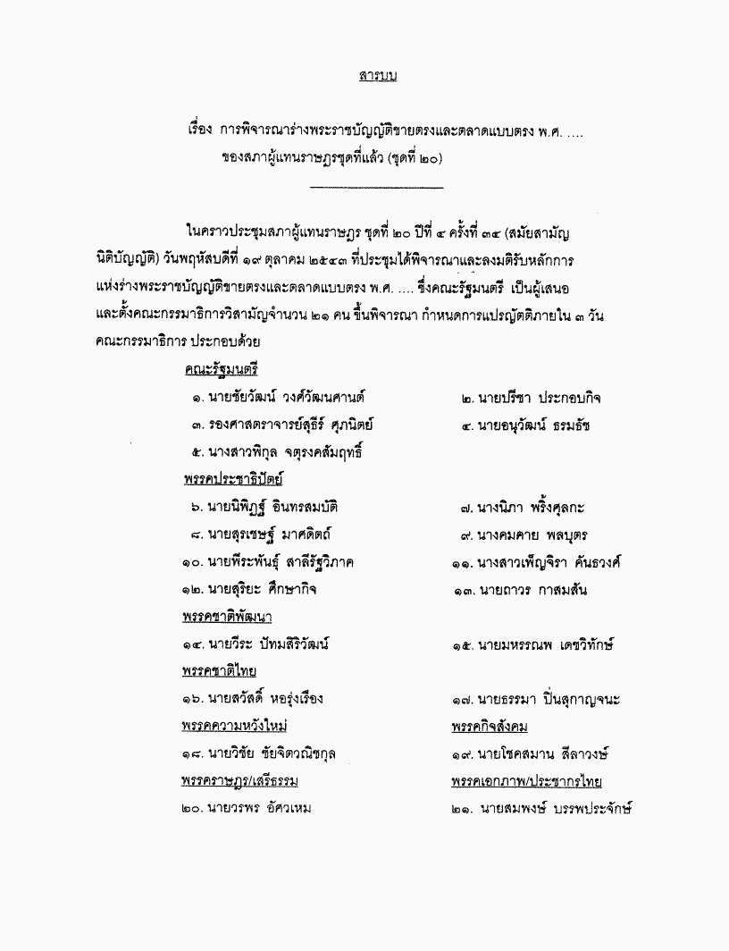 ชื่อเอกสาร :   ร่างพระราชบัญญัติขายตรงและตลาดแบบตรง พ.ศ. .... (ค้างอยู่ระหว่างการพิจารณาของคณะกรรมาธิการของสภาผู้แทนราษฎรชุดที่แล้ว)