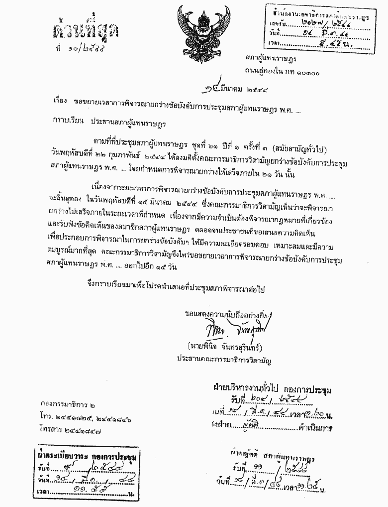 ชื่อเอกสาร : ขอขยายเวลาการพิจารณายกร่างข้อบังคับการประชุมสภาผู้แทนราษฎร พ.ศ. ....