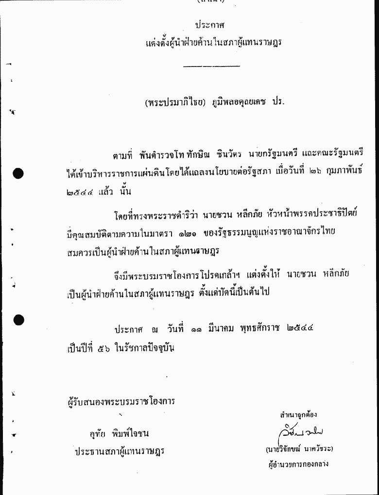 ชื่อเอกสาร : ประกาศ แต่งตั้งผู้นำฝ่ายค้านในสภาผู้แทนราษฎร