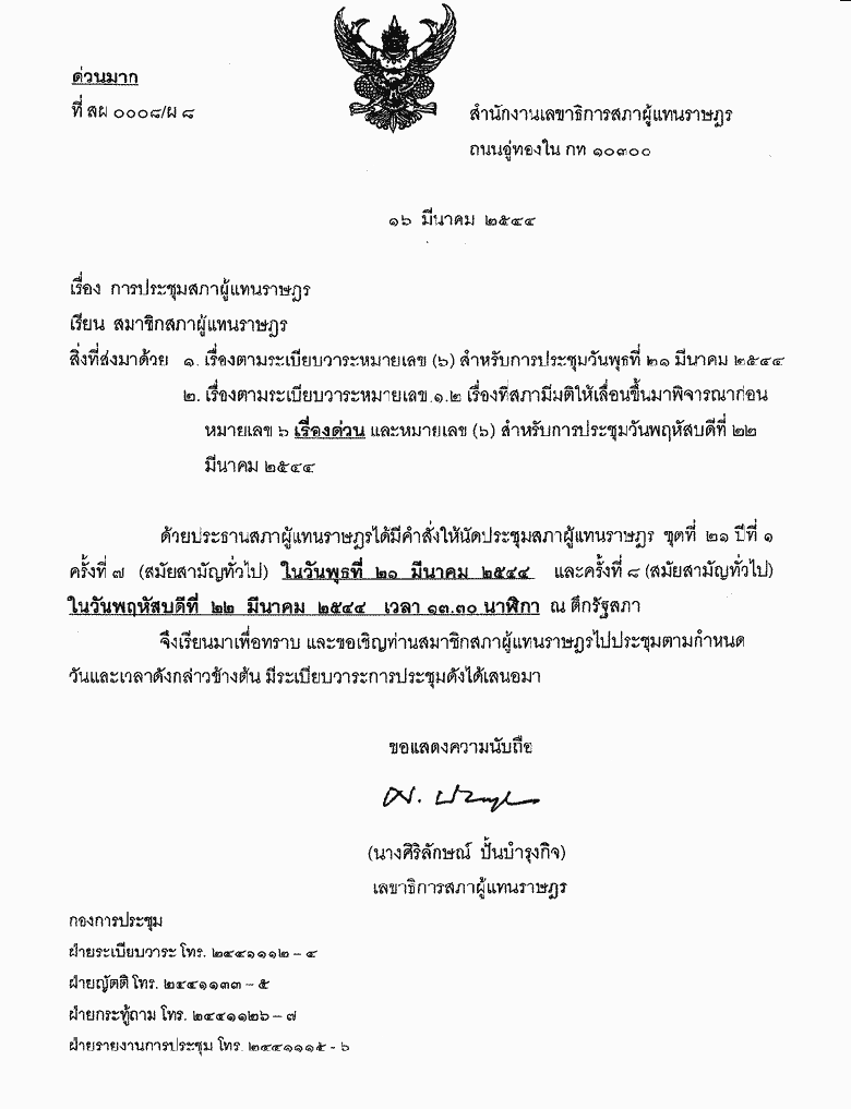 ชื่อเอกสาร : ระเบียบวาระการประชุมสภาผู้แทนราษฎร ชุดที่ ๒๑ ปีที่ ๑ ครั้งที่ ๗ (สมัยสามัญทั่วไป) วันพุธที่ ๒๑ มีนาคม ๒๕๔๔