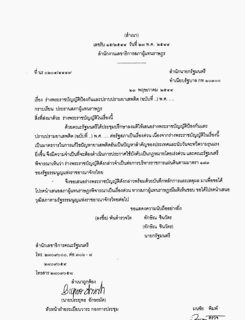 ร่างพระราชบัญญัติป้องกันและปราบปรามยาเสพติด (ฉบับที่ ..) พ.ศ. .... (คณะรัฐมนตรี เป็นผู้เสนอ) |