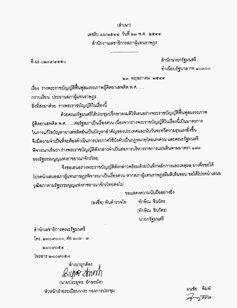 • ร่างพระราชบัญญัติฟื้นฟูสมรรถภาพผู้ติดยาเสพติด พ.ศ. .... (คณะรัฐมนตรี เป็นผู้เสนอ)